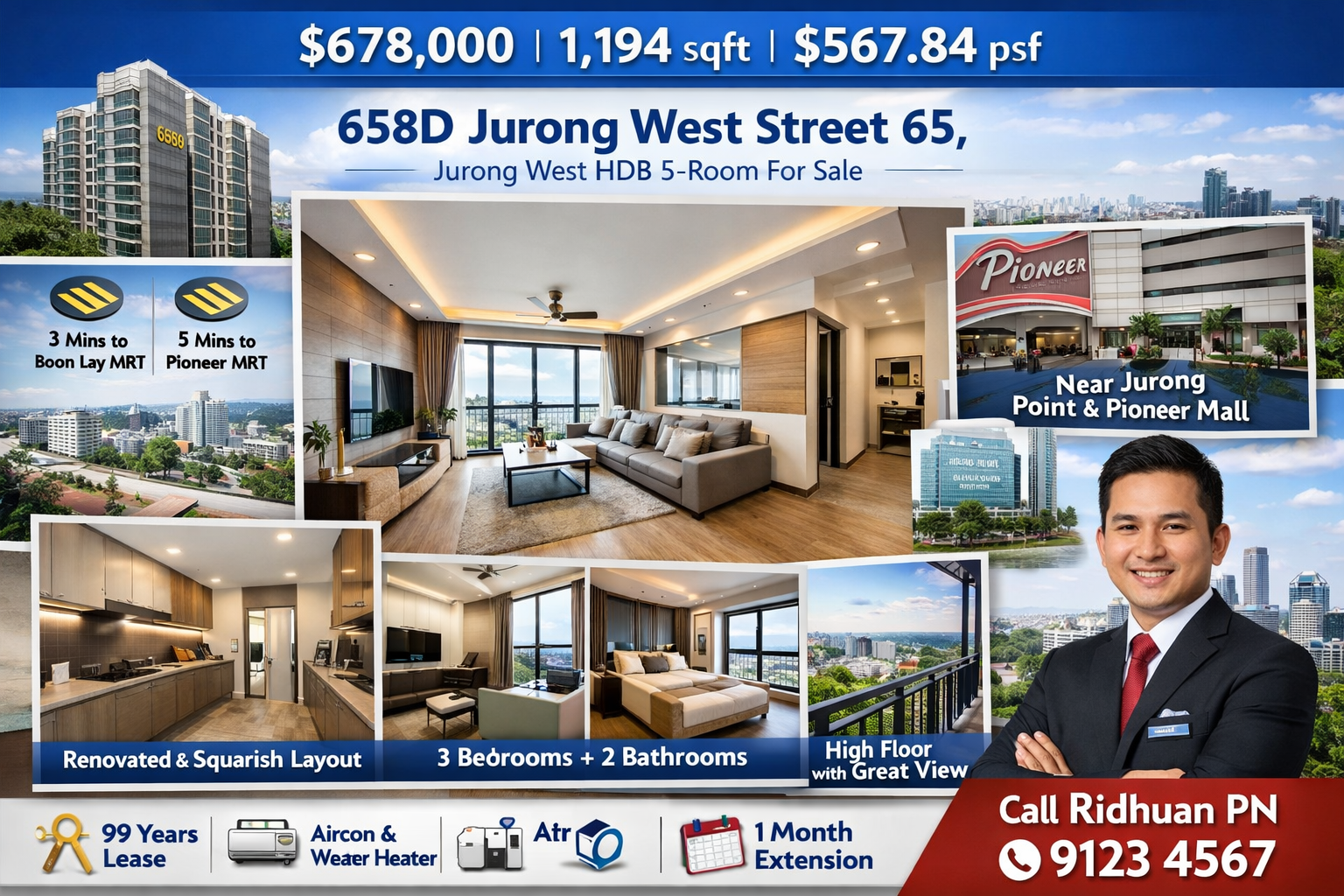 If you are interested in this 5 room HDB for sale at 658D Jurong West Street 65, contact Ridhuan PN today to arrange a viewing. A well-located, beautifully renovated Jurong West HDB flat like this is a rare find.